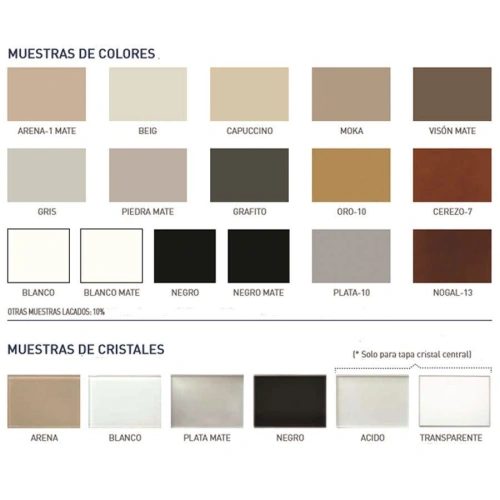 Maderas: Haya o Mukaly Tableros/Molduras: Fibra de densidad media (F.D.M) y de partículas melaminizadas recubiertas de chapa natural y sintética. Cajones interiores: Maderas de pino, tableros de partículas revestidos de chapa natural y de hojas de Cloruro de Polivinilo. Tiradores: Aleación de cinc y cobre al 60/40% con baño electrolítico. Bisagras y Guías: Indaux y Lim. Cristales: Cristalería Española. Resinas: Resipol ND baño electrolícito. Barnizado: Tintado, glaseado manual, fondeado (poliuretano y poliester) y acabado en poliuretano.